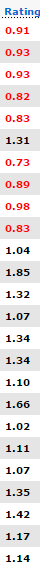 | 14 - 17 | -3 | 72.2 | 66.7% | 0.84 | |